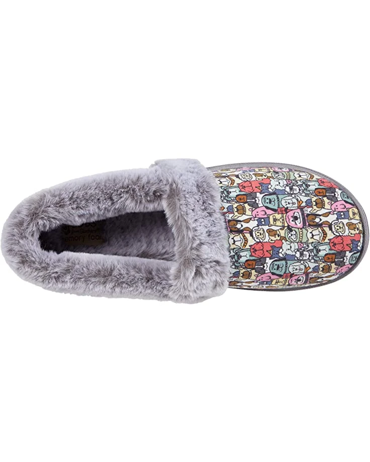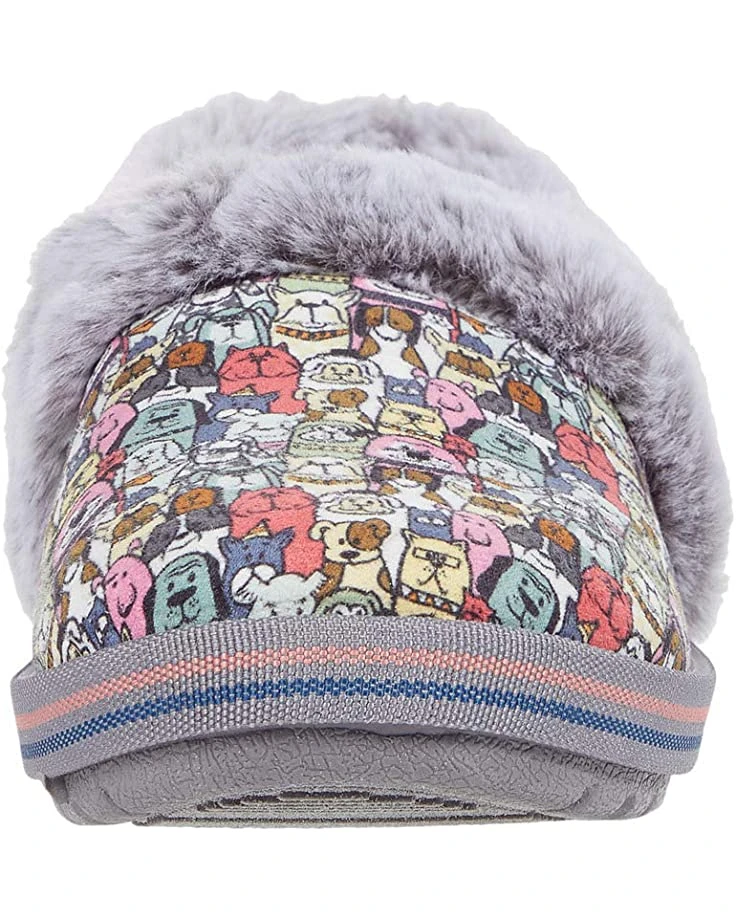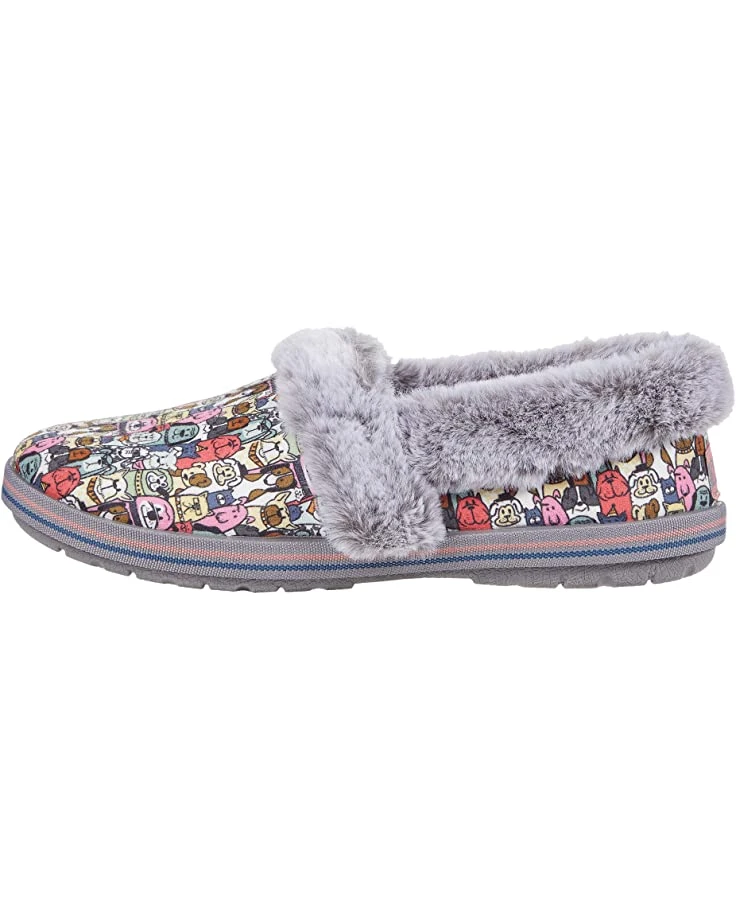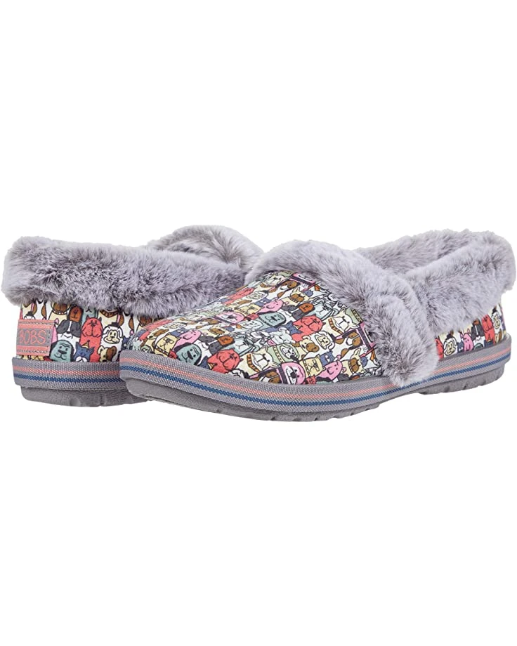 - A plush faux-fur collar, colorful cartoon dog print, and slip-on design make the BOBS from SKECHERS® Too Cozy – Snuggle Rovers slipper the perfect style to keep you warm and comfortable this cold-weather season.