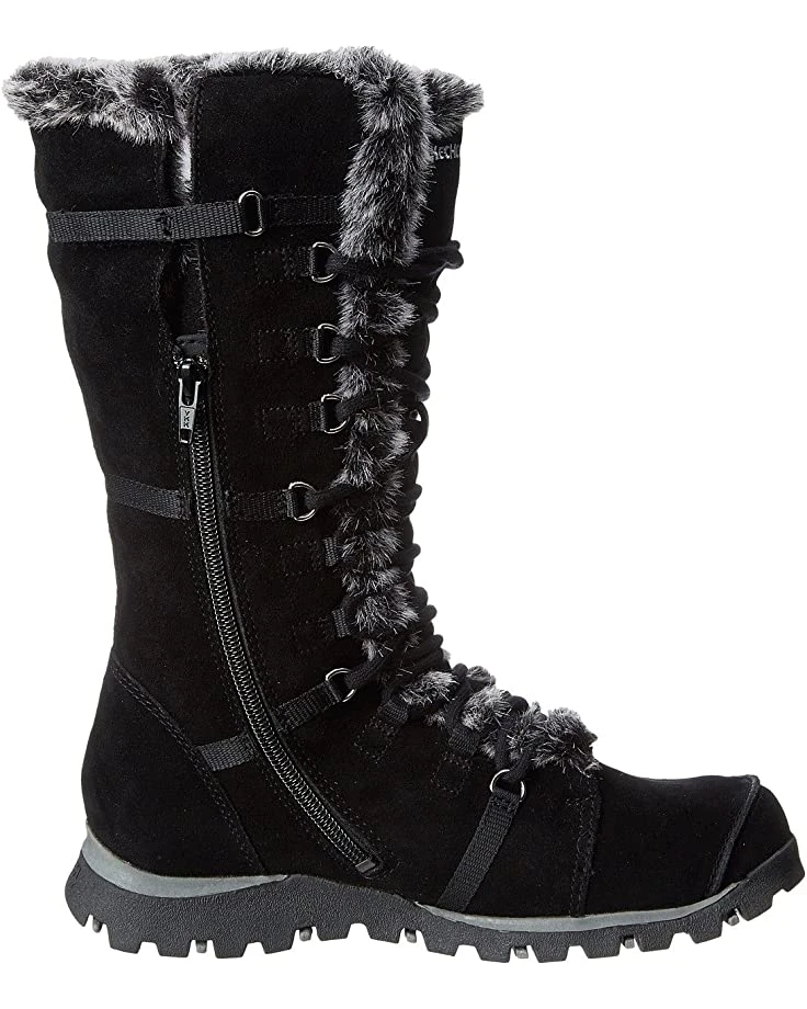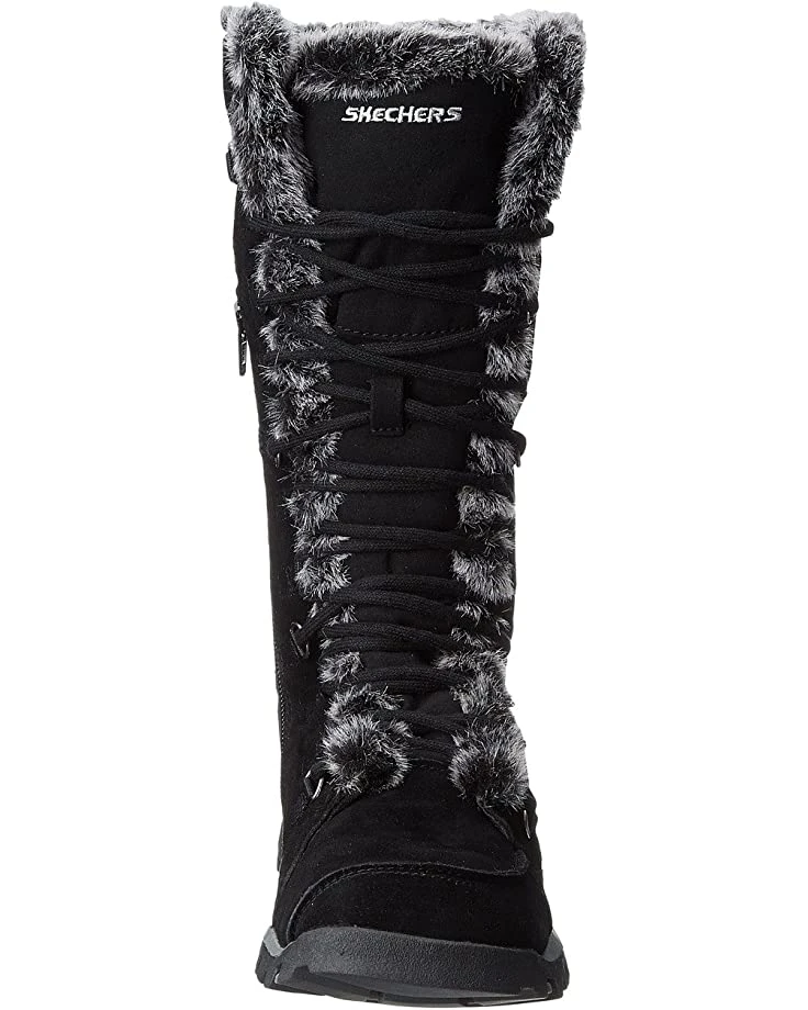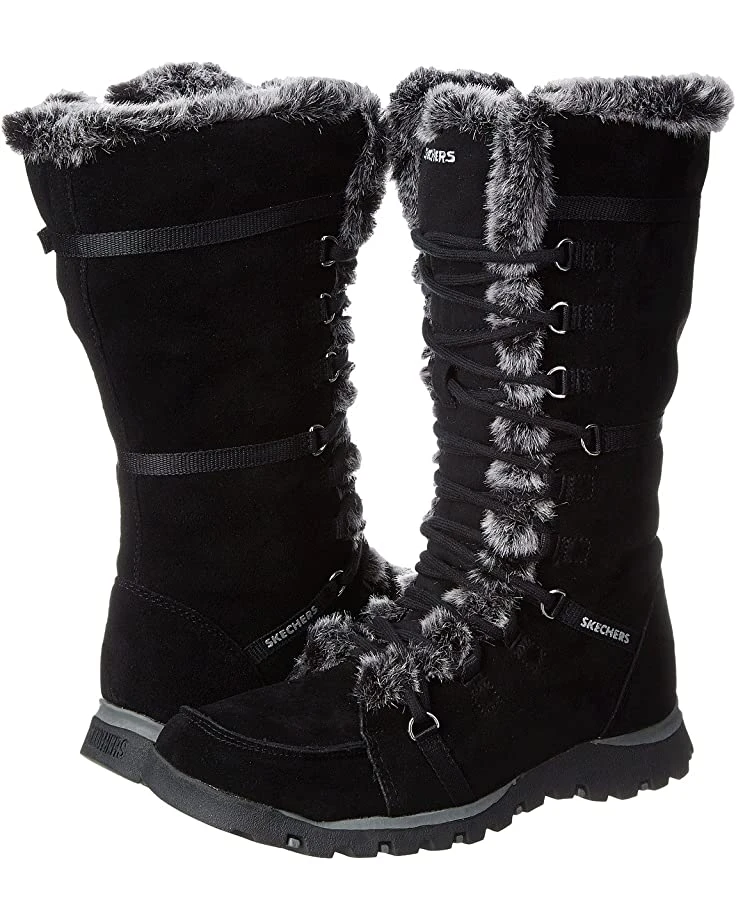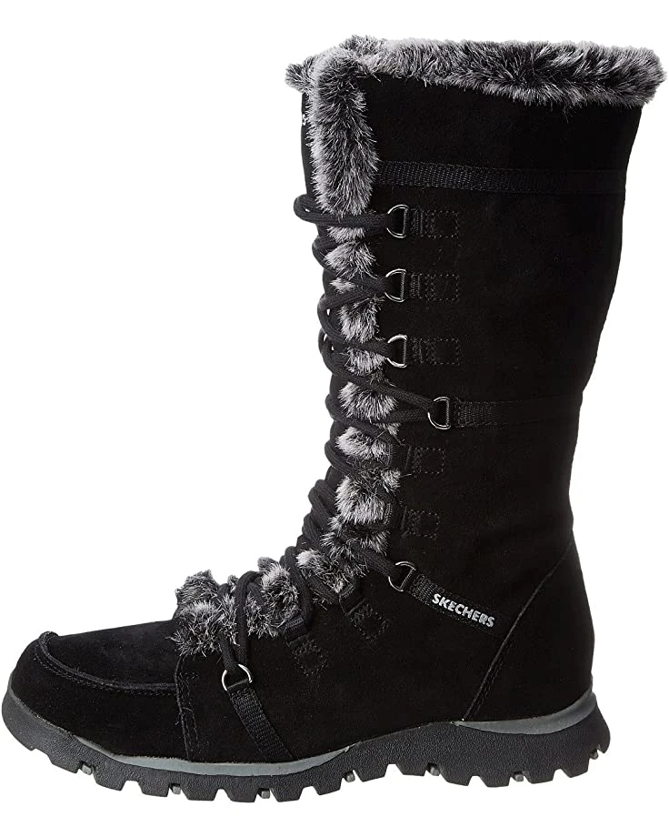 - The SKECHERS® Grand Jams – Unlimited boot is a must-have cold-weather style with a supple suede upper finish, faux-fur trim, and rounded toe with a raised stitch seam.
