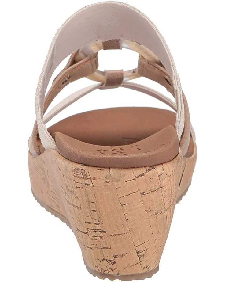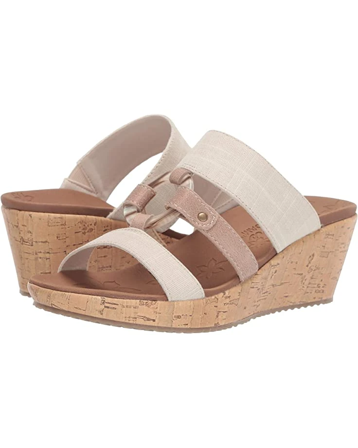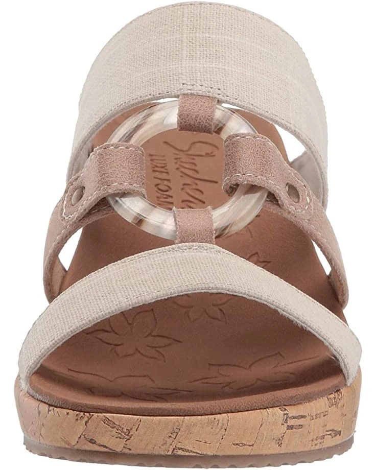 - The SKECHERS® Beverlee – Sail Away sandal will elevate your poolside look this season with a woven canvas fabric upper, a metal center ring accent, and a cork-wrapped platform and wedge heel.