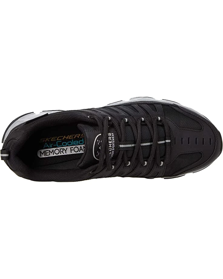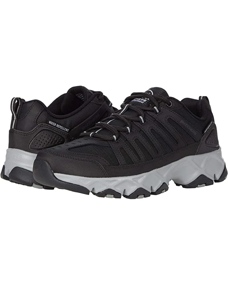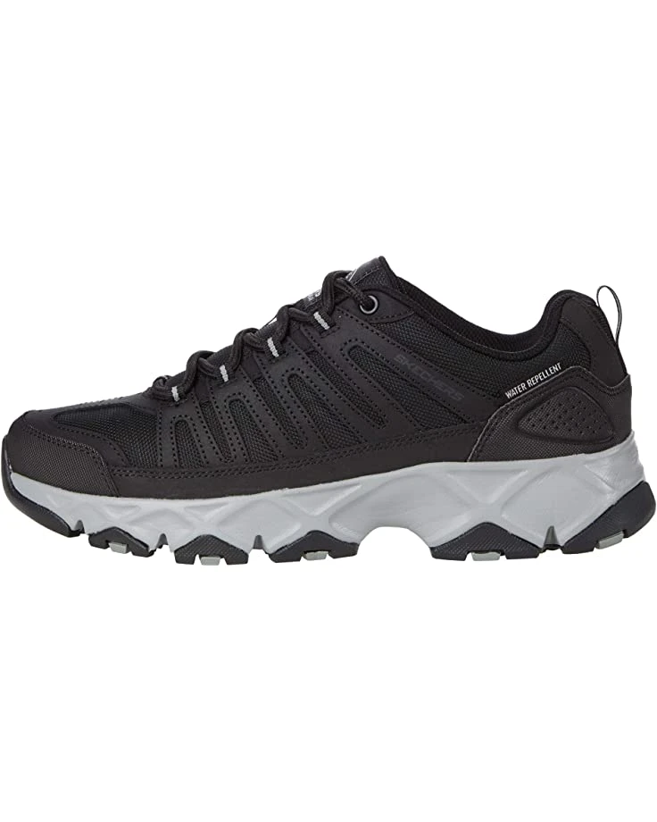 - The SKECHERS® Crossbar sneaker will ensure that you can face any terrain with a hiking-style silhouette, durable action leather upper, synthetic overlays, mesh cooling panels, and a water-repellent design.