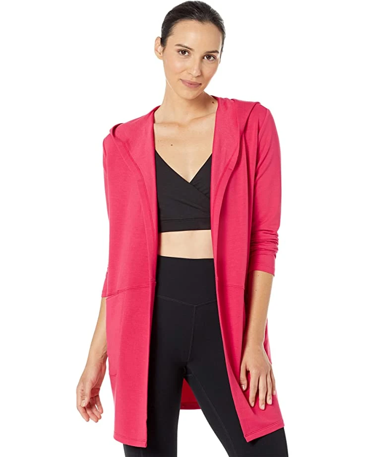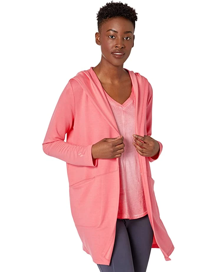 This hooligans is a nice layering piece when the weather is cool. Fits and drapes well. Wish it came in more colors. I bought the first one in black for international travel and liked it so well I bought the raspberry color. I kept the raspberry but not in love with the color. It was more purple than pink but it’s not bad. Comfortable and nice looking topper.