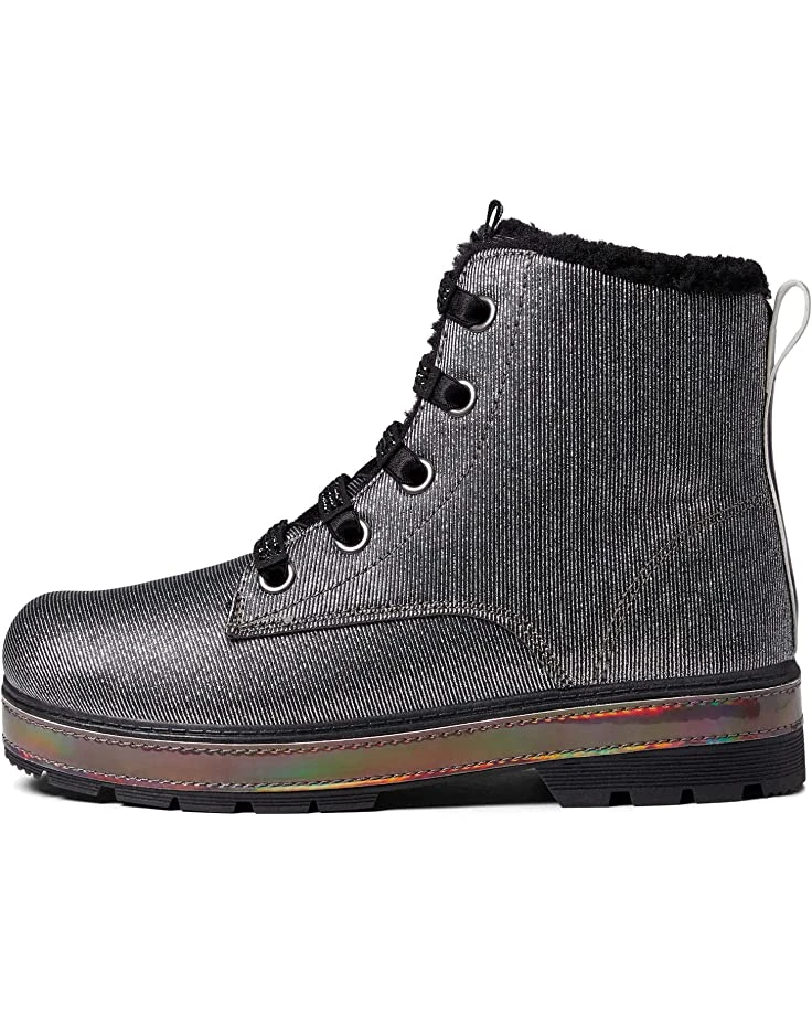 - Metallic denim-effect synthetic upper with plush faux fur trim.