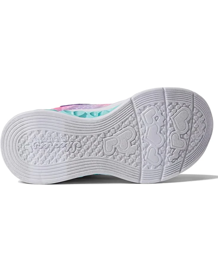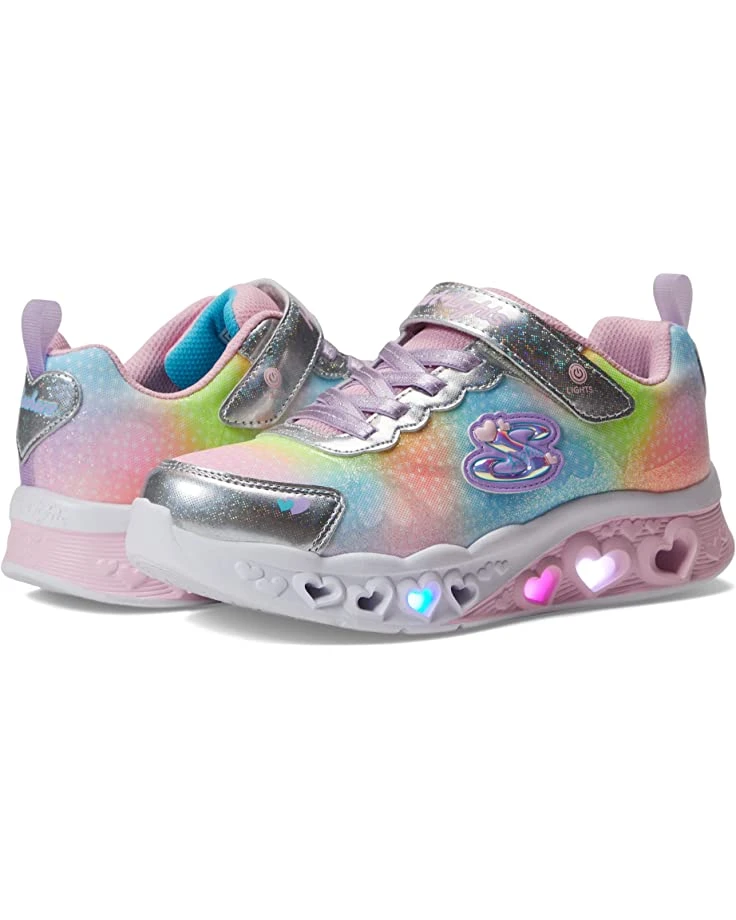 - Featuring a hook-and-loop closure, the SKECHERS® KIDS Sport Lighted – Flutter Heart Lights – Simply Love 302315L Sneakers come with a multicolored design.