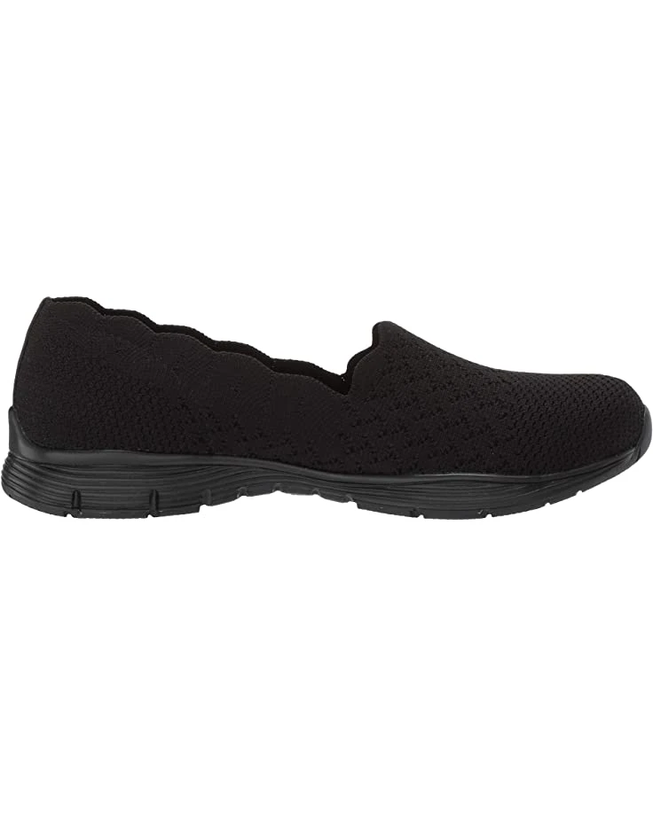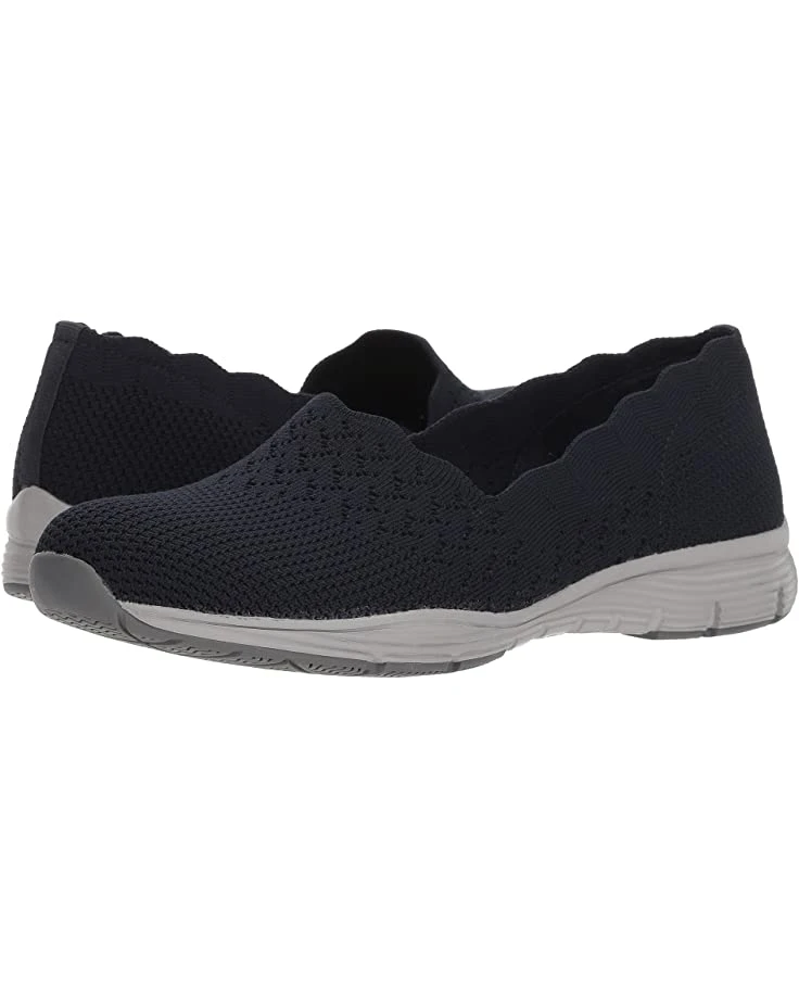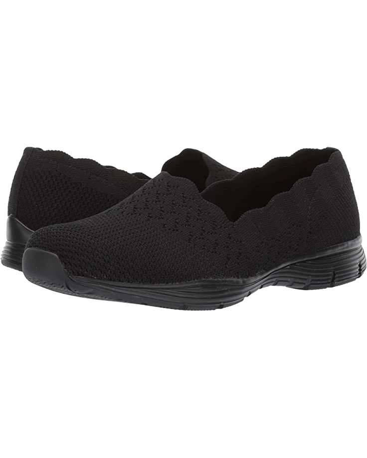 - The SKECHERS® Seager – Stat shoe will allow your feet to feel free with easy slip-on styling, a chic scalloped topline, and premium cushioning.