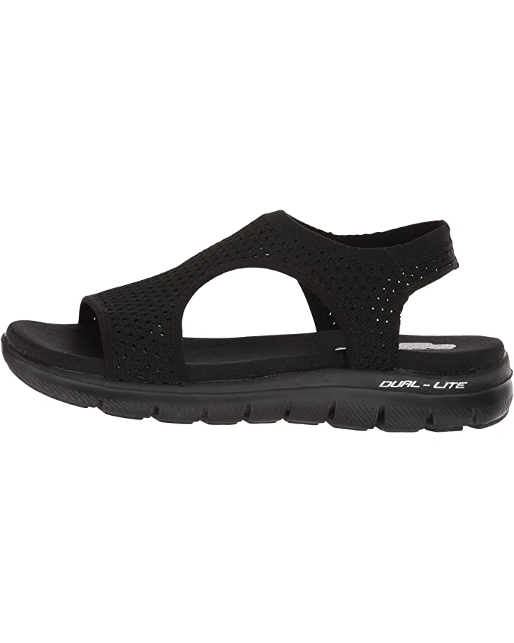 - The SKECHERS® Flex Appeal 2.0 – Déjà Vu sandal offers a sporty silhouette with a Skech-Knit™ mesh fabric upper, open toe, T-strap design, and side cutout accents.