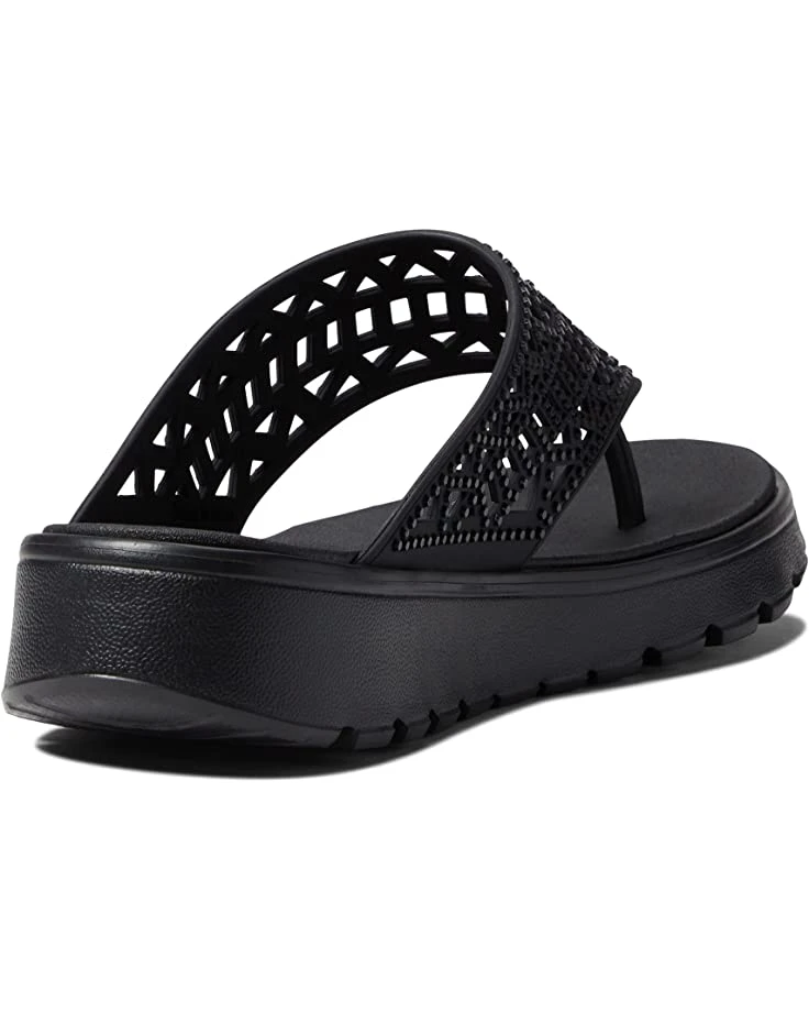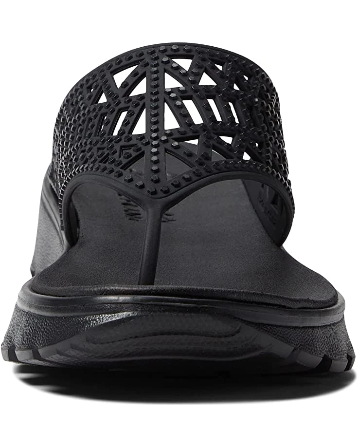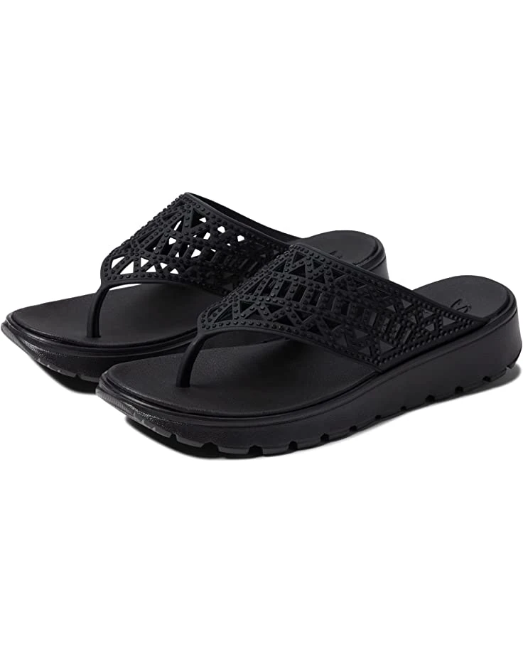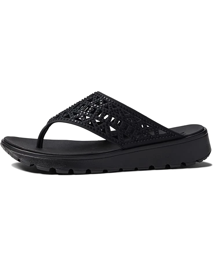- Flip-flop sandals showcasing synthetic upper with geometric cutouts and rhinestone detailing.
