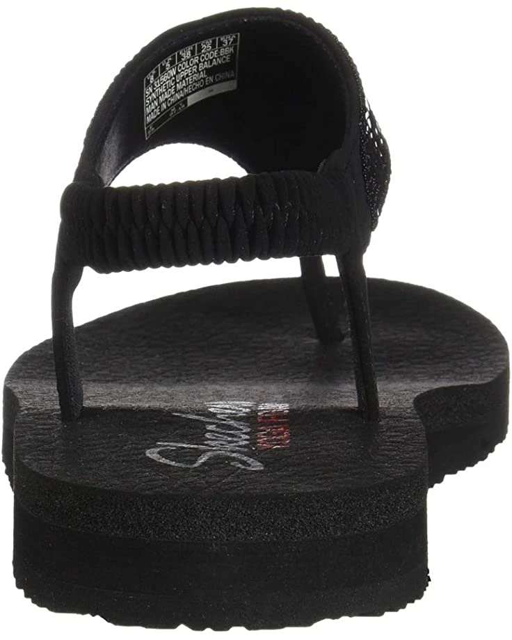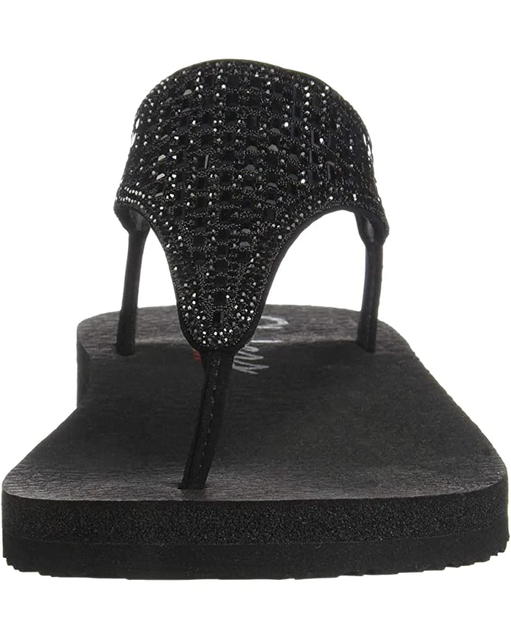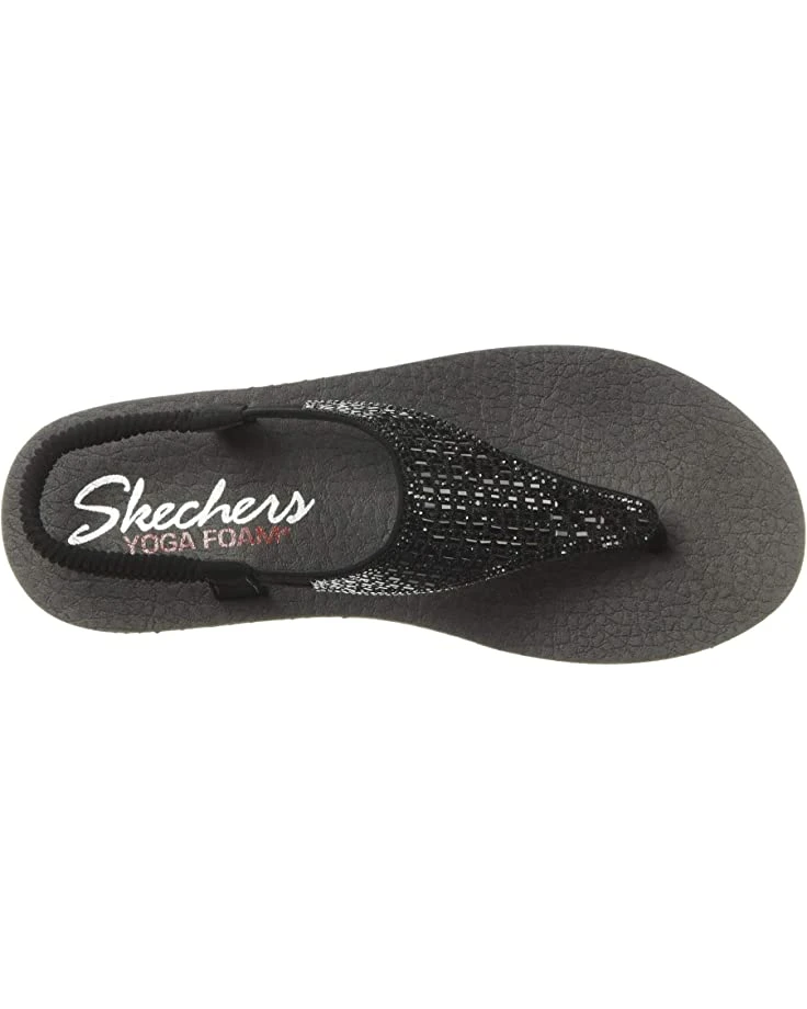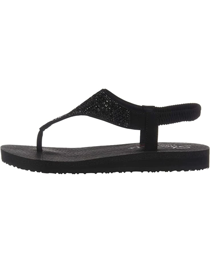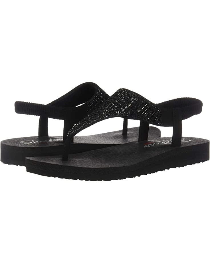 - The SKECHERS® Meditation – Rock Crown sandal lends a dose of glam to your summery-chic look with mixed rhinestone embellishments at the vamp strap, a smooth synthetic upper, and thong-style silhouette.