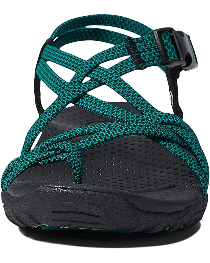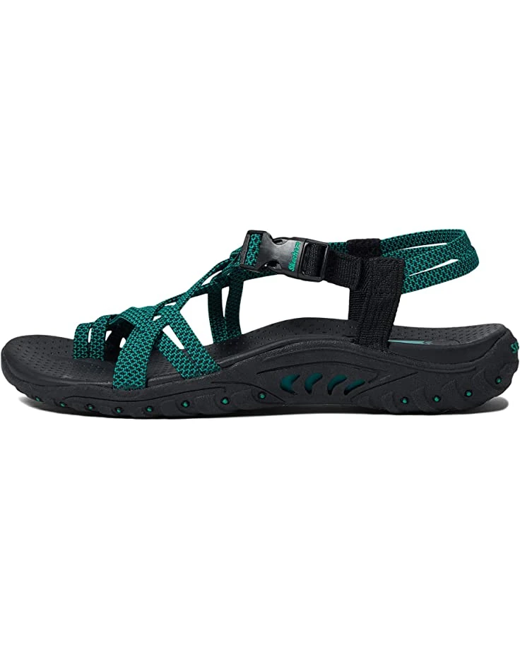- The SKECHERS® Reggae – Irie Mon sandal boasts comfort and eye-catching style with a river-style design, woven straps, and an open toe.