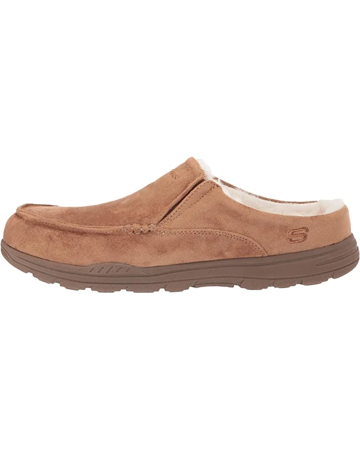 - The SKECHERS® Expected X Verson slipper offers optimal comfort with a suede-like finish, slip-on construction, and a faux-fur collar trim.