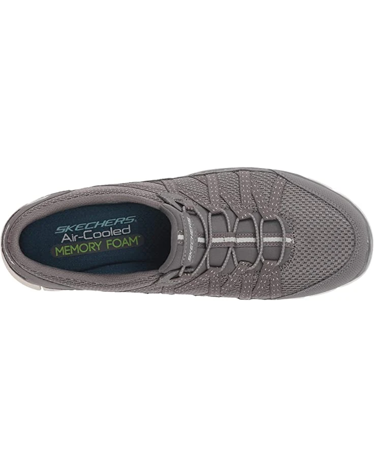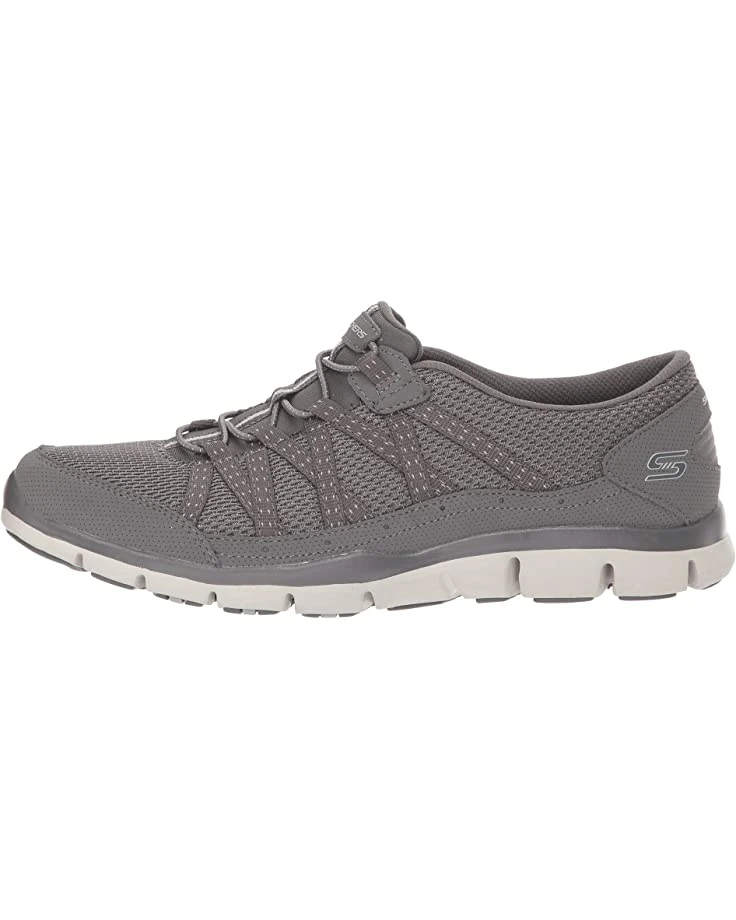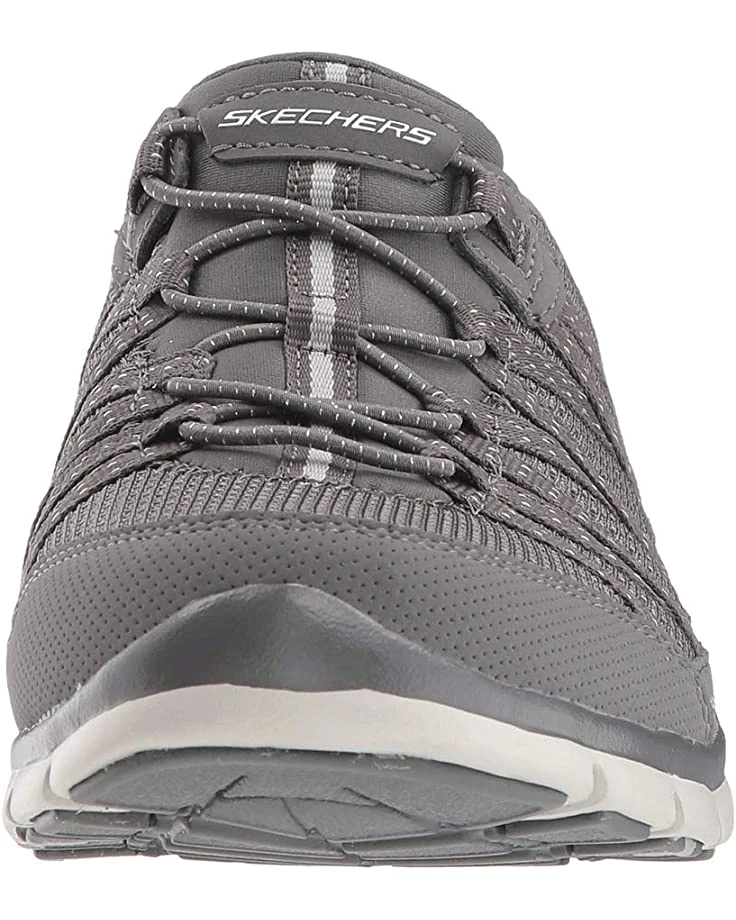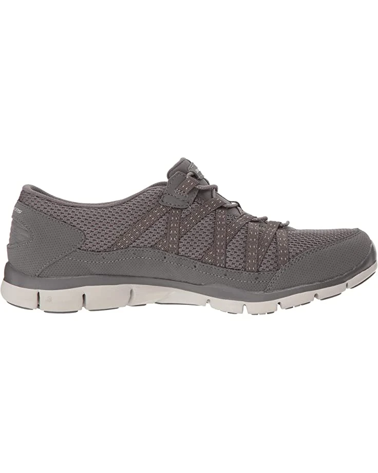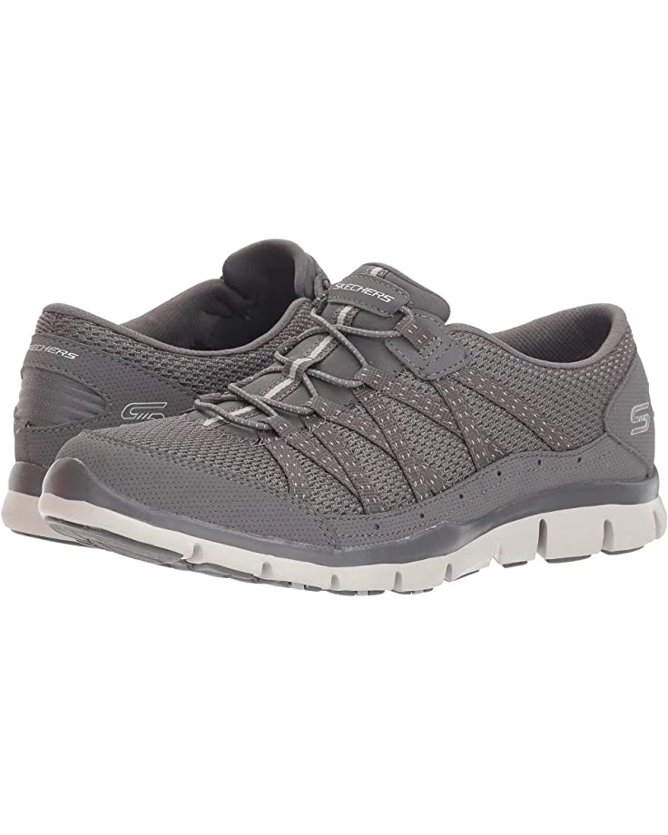 - The SKECHERS® Gratis – Gratis Strolling sneaker offers easy comfort with a synthetic nubuck and mesh fabric upper, a slip-on construction with a bungee laced front panel, and optimal comfort features.